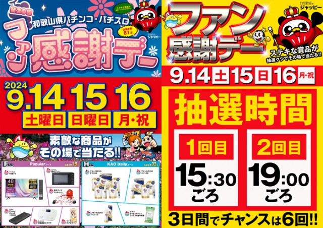 田辺市明日9月8日(日)は特別賞品入荷!9:45☆抽選入場☆