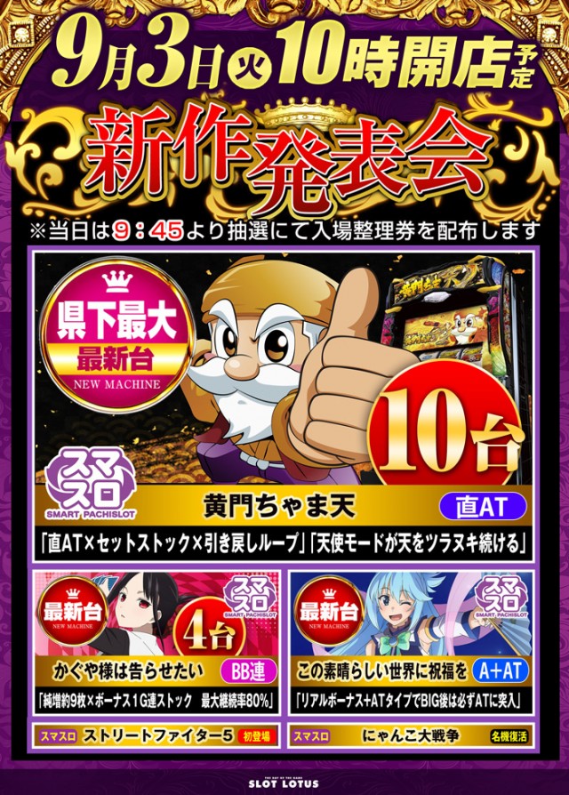 🌈本日9月9日【月】は全台10時開店 9:45抽選入場🌈