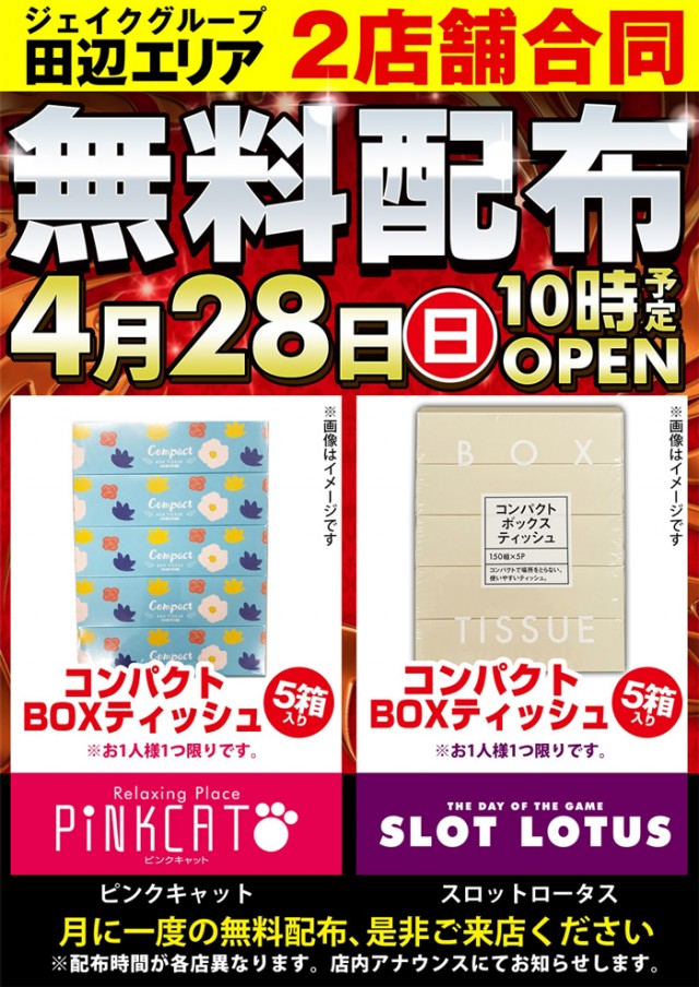 本日は(BOXティッシュ5P)無料配布 9:45抽選入場🌈