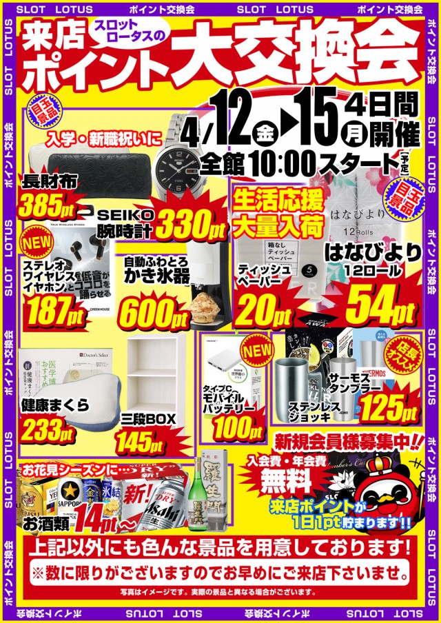 明日4月12日(金)は特別賞品入荷!9:45☆抽選入場☆