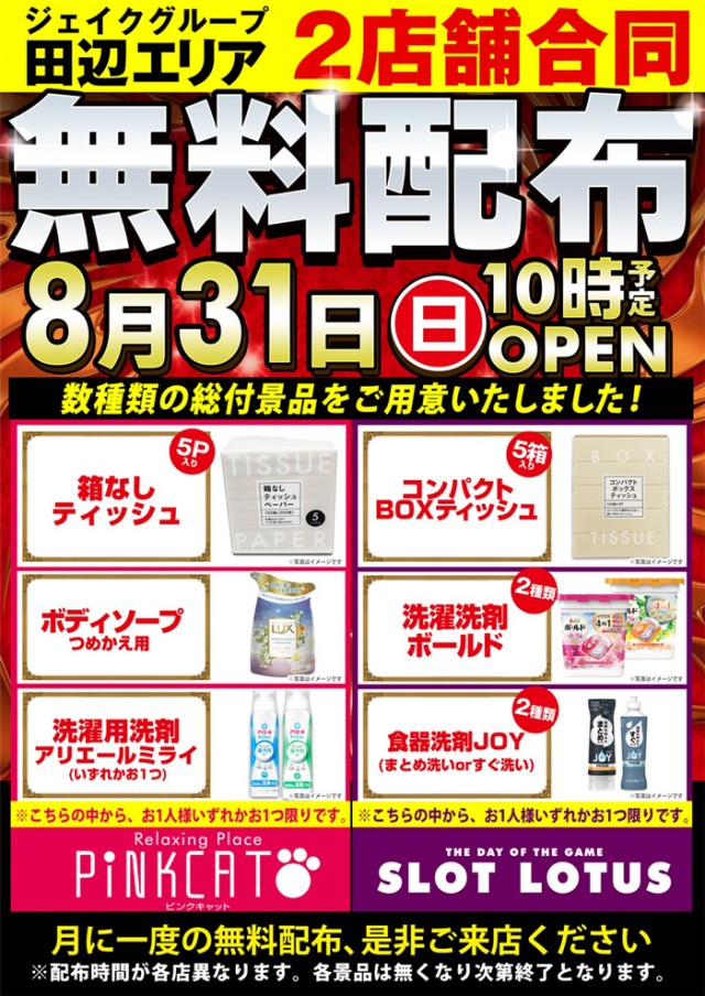田辺市本日8月31日(日曜日)は恒例の2店舗合同無料配布