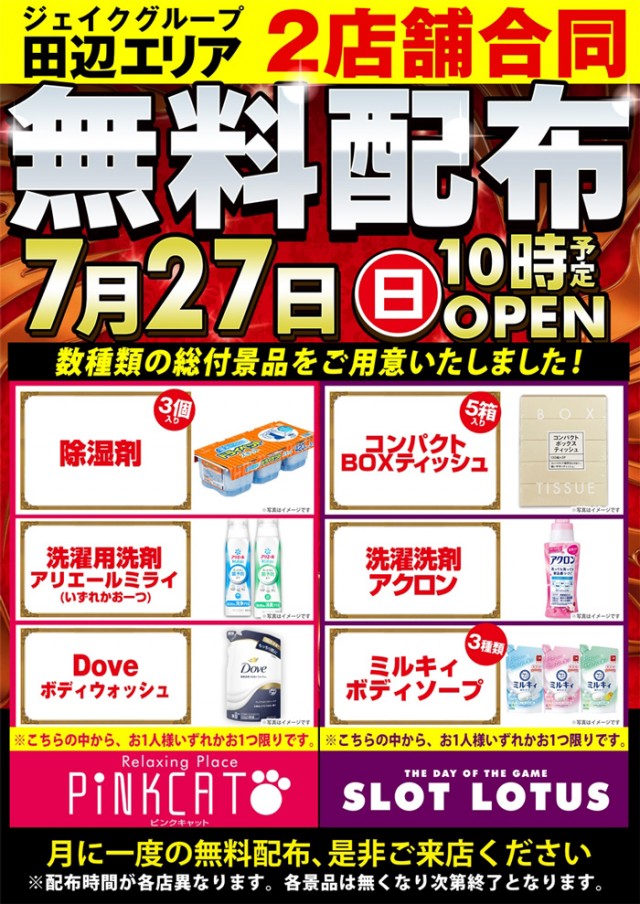 田辺市本日7月27日(日曜日)は恒例の2店舗合同無料配布