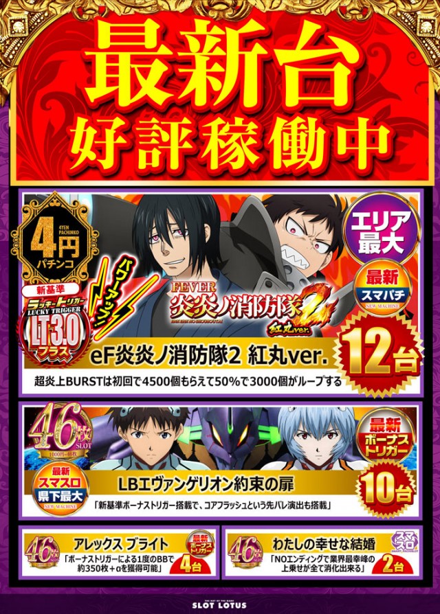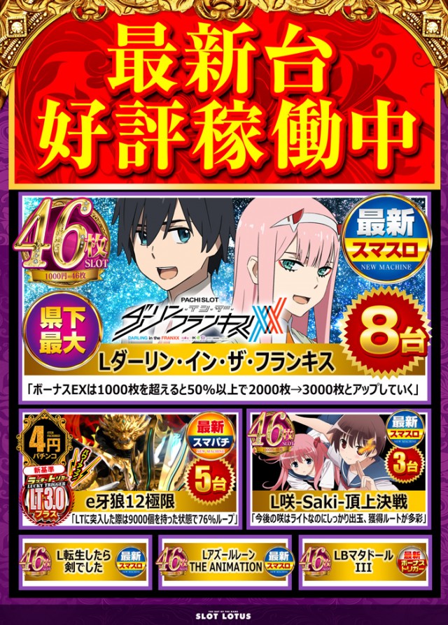 県下最大SLOT圧倒的LOTUSで、是非お楽しみ下さいませ