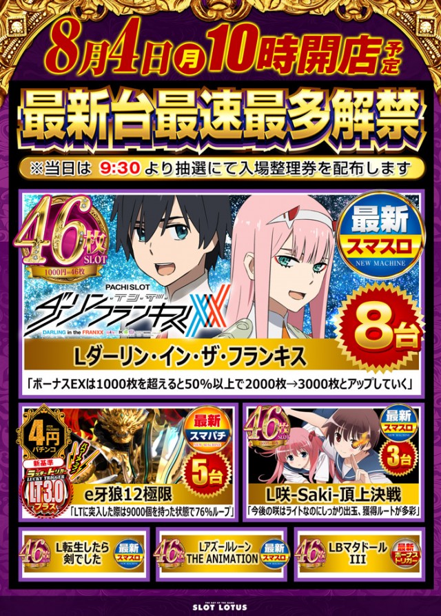 本日8月4日(月)は☆最新台最多10時最速OPEN☆