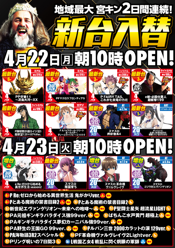 本日23日(火)2日連続新台入替!朝10時開店!!