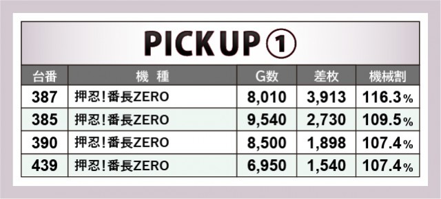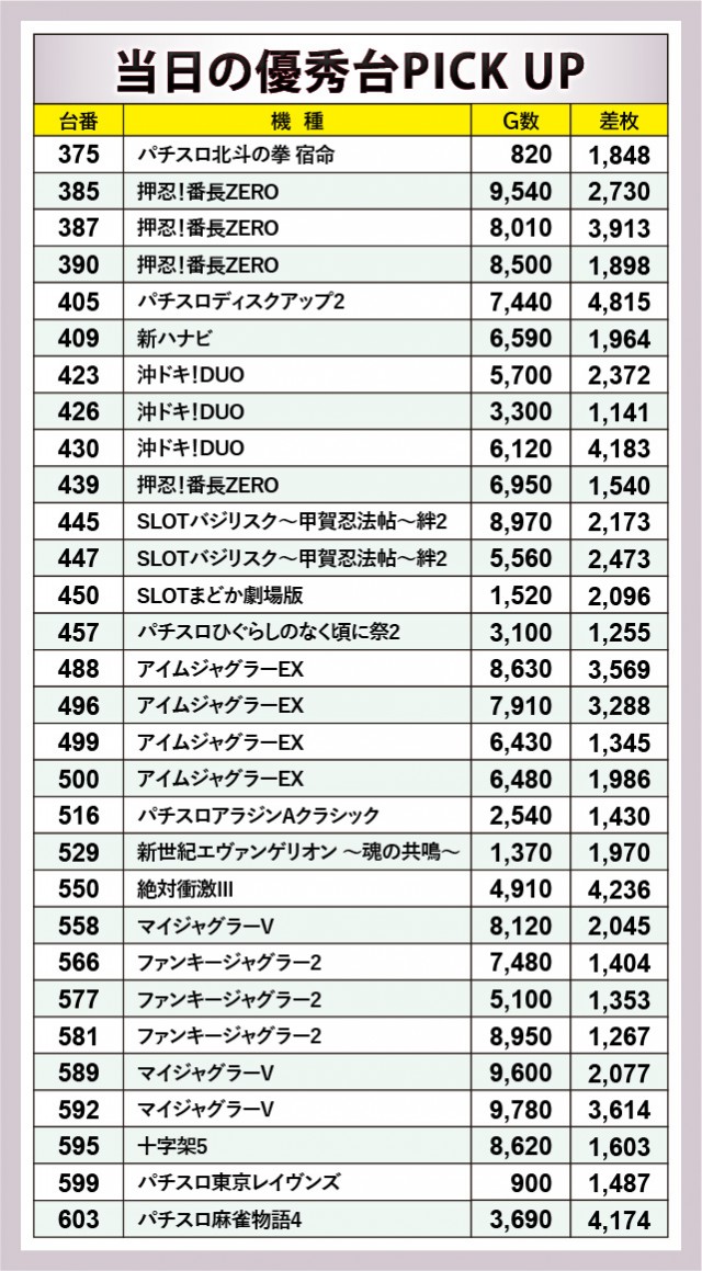 『パチスロディスクアップ2』405番台+4,815枚の記録を筆頭に、『沖ドキ!DUO』『絶対衝激Ⅲ』『パチスロ麻雀物語4』の3機種でも4千枚OVERが発生した。また『押忍!番長ZERO』『SLOTバジリスク~甲賀忍法帖~絆2』の2トップも奮闘しており、より多くのゲーム数が消化されていたことが分かる。特に『押忍!番長ZERO』の盛り上がりには目を見張るものがあり、それは遊技していたファンが一番理解していたはずだ。
