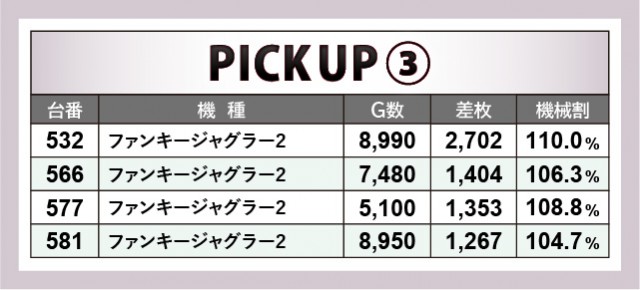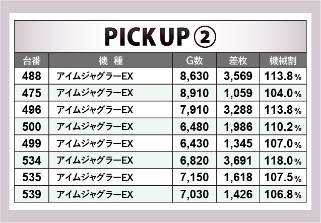 優秀台をチェックしても分かるように、『ジャグラー』シリーズの安定した活躍が印象的な内容だ。『アイムジャグラーEX』から3千枚OVERが2台飛び出しており、『マイジャグラーV』でも592番台+3,614枚が発生。消化されたゲーム数も多く、回転を重ねるごとに手ごたえを感じていたのは間違いないだろう。