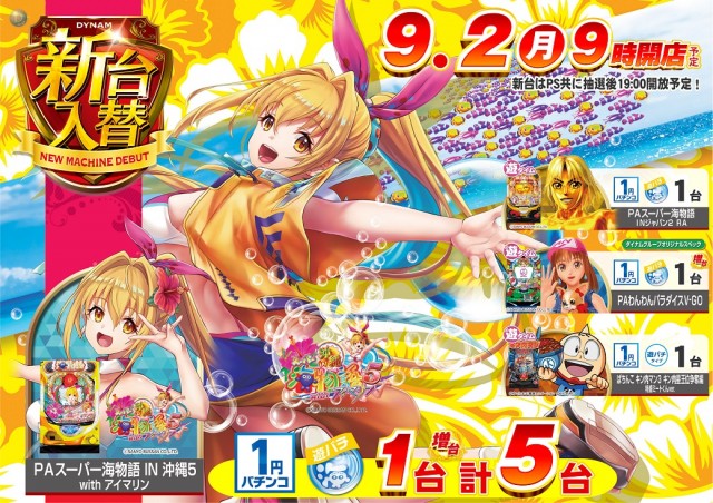 本日7月12日(金) 新台入替1円増台!19開店予定