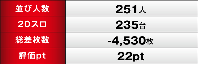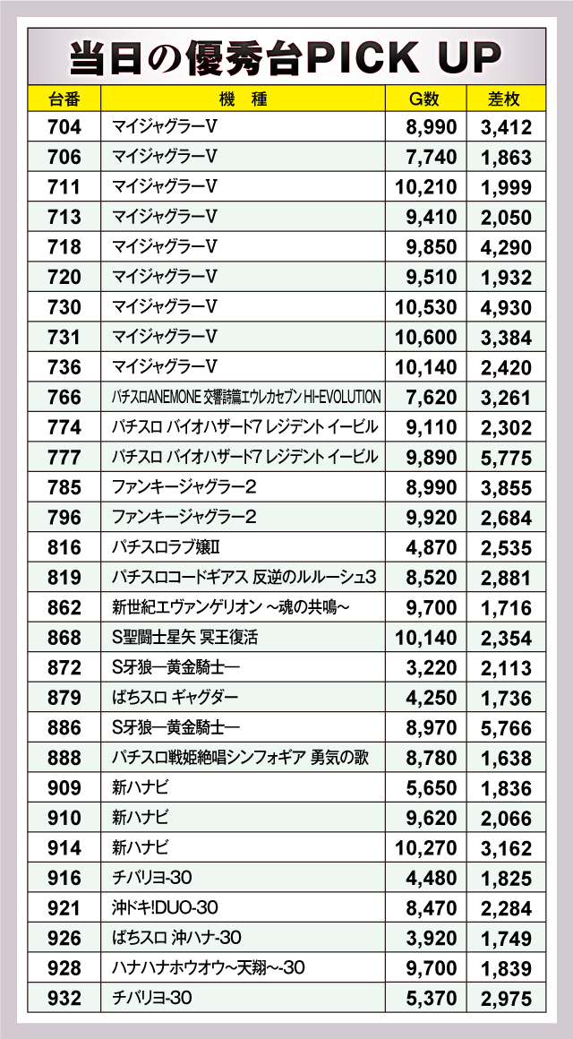 全体の総差枚は、わずかながらマイナスとなってしまったが、1台平均差枚は-19枚とすぐに逆転できそうな数値だ。次回取材の折には、ぜひ総差枚数もプラスとなり、完全勝利をこの目に焼き付けたい!!