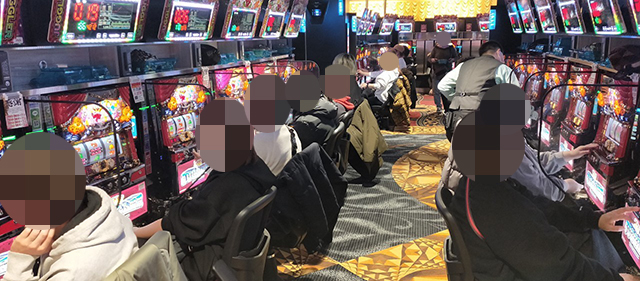 英雄候補たちの満面の笑みがあちこちで見られるホール内。どのコーナーにも美味しそうな台ばかりで、プレイしているファンを羨望の眼差しで見ているぱちタウン取材班だったが、この日特に驚かせられたのが『マイジャグラーV』コーナーだ。1万G以上ぶん回された台が多数出現。それだけぶん回されるということは、よほどの優秀だったのだろう。とにかく、同機種のコーナーには光り輝く光景が広がった。