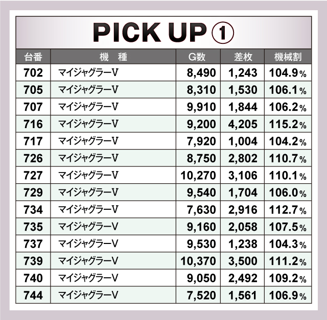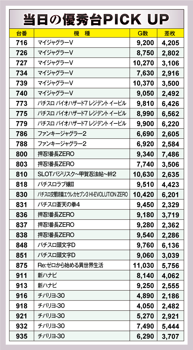 こちらに当日の優秀台を30台ピクアップしたが、どれもこれもよだれが出そうになるくらい打ちたい台ばかり。5,000枚オーバーの台も8台記録するなど、英雄候補たちにとって歓喜の1日となったようだ。さらに、特に注目すべき機種である、『マイジャグラーV』『バイオハザード7』『番長ZERO』『チバリヨ』を別に取り上げてみたぞ!