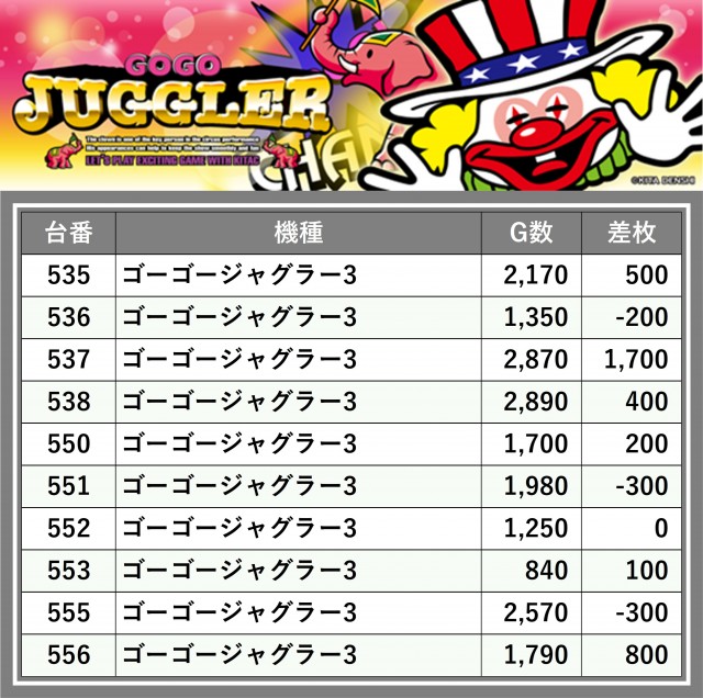 厳選された取材対象機種をはじめ、その他スロット全体から好記録が飛び出した!プレイヤーが楽しんだ1日を下記データにて振り返ってみて欲しい。