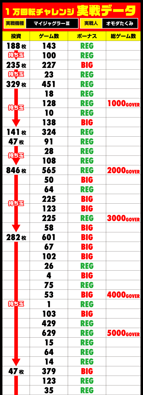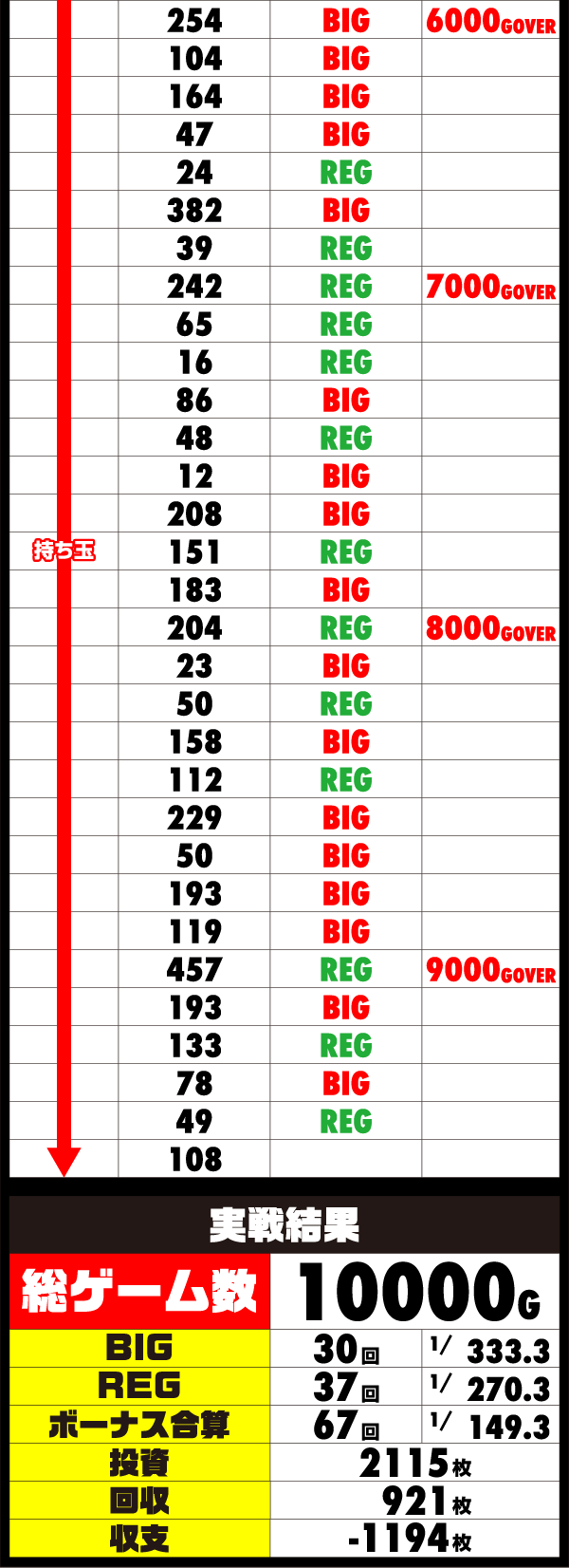 序盤からボーナスがREGに偏り、思うように出玉を増やせないままチャレンジは終了。