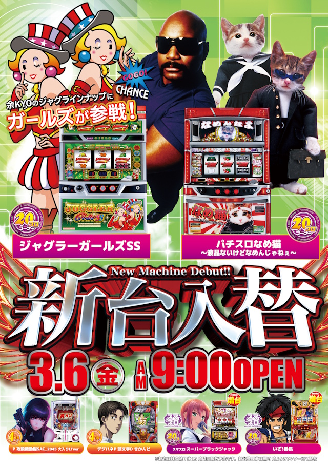 本日新台入替🌟ジャグラーガールズ・なめ猫など6機種導入🌟