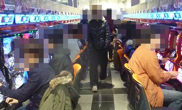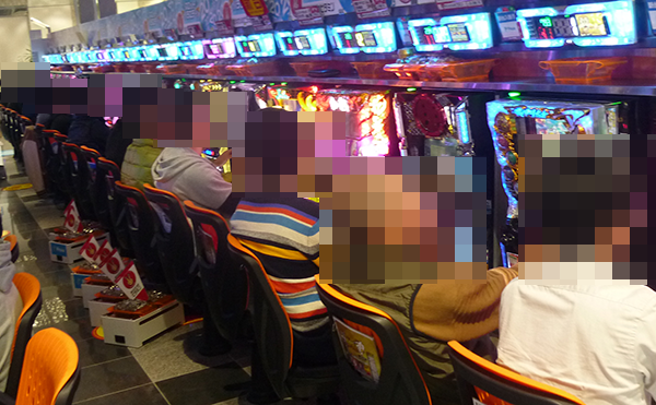 15時頃のパチスロをみると、「バジリスク~甲賀忍法帖~絆」や「沖ドキ!」といった朝から人気の機種に笑顔のプレイヤーが多数。