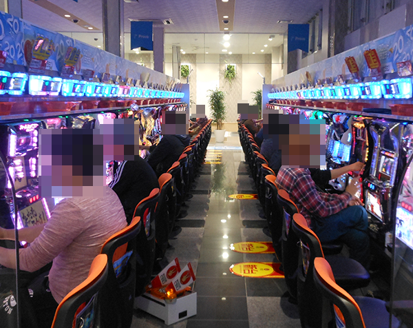 開店直後のホール内の状況は、パチンコでは海物語シリーズ、パチスロはジャグラーシリーズや「バジリスク~甲賀忍法帖~絆」などに人気が集まっており、プレイヤーは明るい表情で遊技をはじめていた。