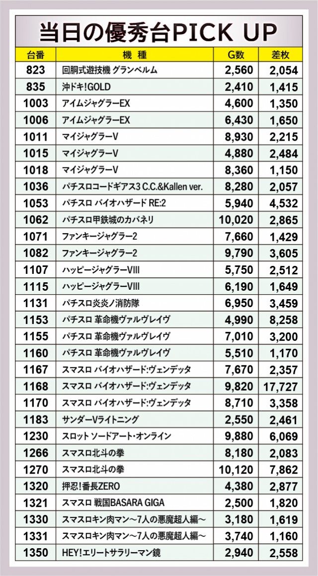 当日は『スマスロ バイオハザード:ヴェンデッタ』1168番台+17,727枚という凄まじい熱気が放たれ、多くのファンが度肝を抜かれたことだろう。さらに『パチスロ 革命機ヴァルヴレイヴ』1153番台+8,258枚や『スマスロ北斗の拳』1270番台+7,862枚など、大きな熱量が発生していたのも見逃せない。また2台の万回転OVERも発生しており、活気に溢れていたのも好感を覚えるポイントだ。