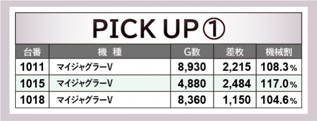 『マイジャグラーⅤ』ではコンスタントなボーナス当選を確認できた。2台の8千回転OVERから、朝から閉店まで打ち尽くされた事実を窺うことができ、2台の2千枚OVER台が生まれた事実からは、安定したパフォーマンスを披露していた様子が分かる。遊技していたファンは、GOGOランプの輝きに癒されていたことだろう。