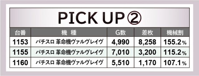 そして『パチスロ 革命機ヴァルヴレイヴ』では、1153番台+8,258枚という大きな熱量を確認できる。こちらもしっかりと可能性を見出しながら遊技されていたため、手応えを感じたファンは満足度の高い1日を過ごせたはずだ。1155番台+3,200枚という記録も見逃せず、同機種らしいポテンシャルが発揮されていた。
