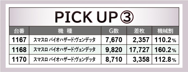 『スマスロ バイオハザード:ヴェンデッタ』では、1168番台+17,727枚という記録が何よりも目に焼きつく。しかしこの他にも2~3千枚OVER台が発生、さらに回転数から相当な手応えを感じてか、閉店まで打ち倒された形跡が見られる。こちらも凄まじいポテンシャルを秘めていただけに、ファンは高揚感を抑えきれなかったのではないだろうか。
