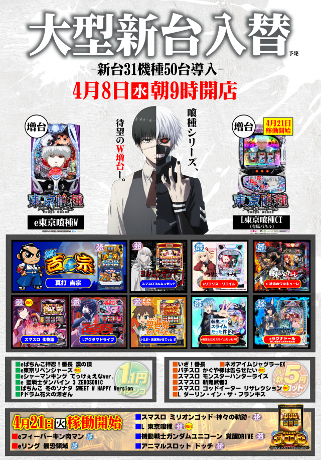【4/7(火) 店休日】【4/8(水) 大型新台入替予定】