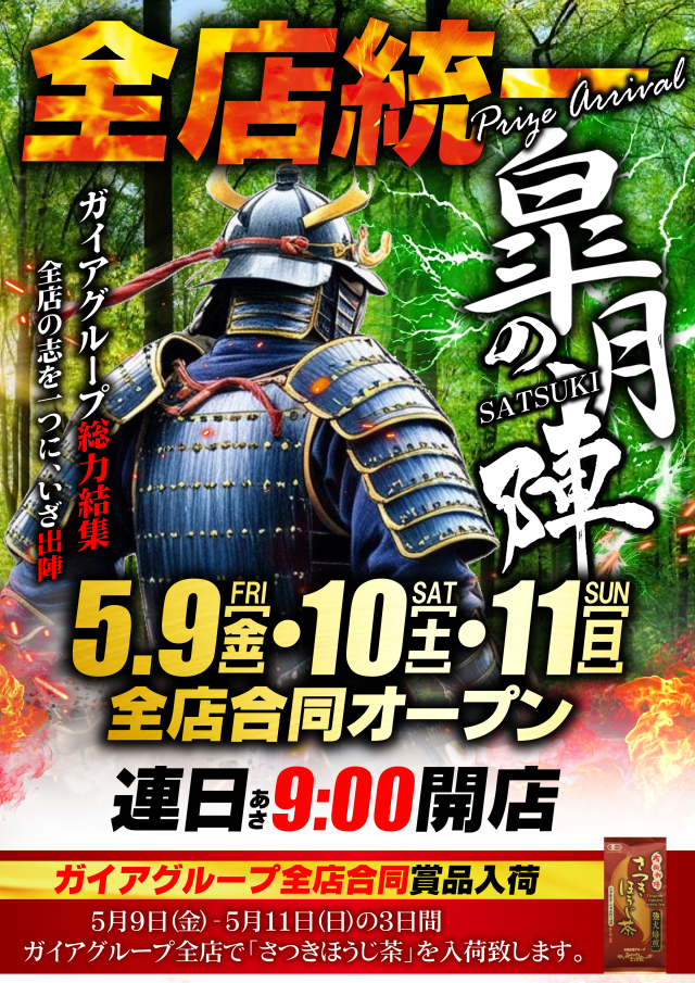 【お客様への重要告知です】お待たせいたしましたっ❗️❗️5月9日(金)5月10日(土)5月11日(日)✨ガイアグループ全店統一✨⚡️⚡️⚡️【皐月の陣】⚡️⚡️⚡️ガイアグループの総力を結集全店の志を一つに…いざ出陣❗️❗️❗️「連日全店合同商品入荷」本日からの3日間、新生ガイアをご体感ください❗️混雑が予想されますので、朝一からのご来店お待ちしております。