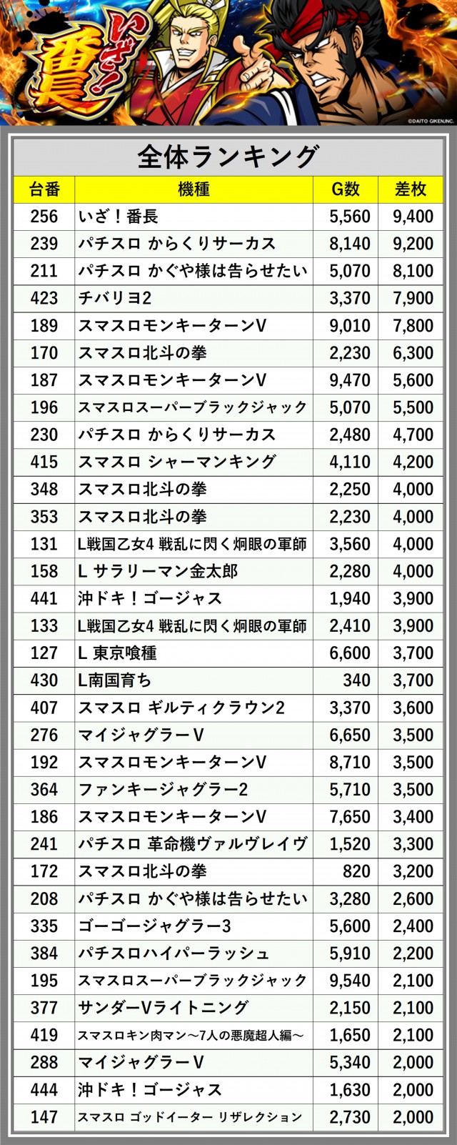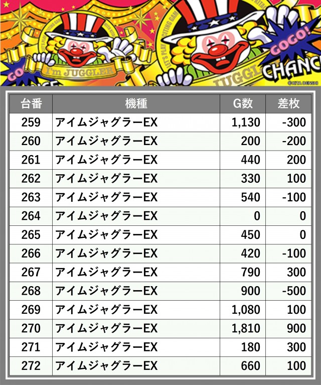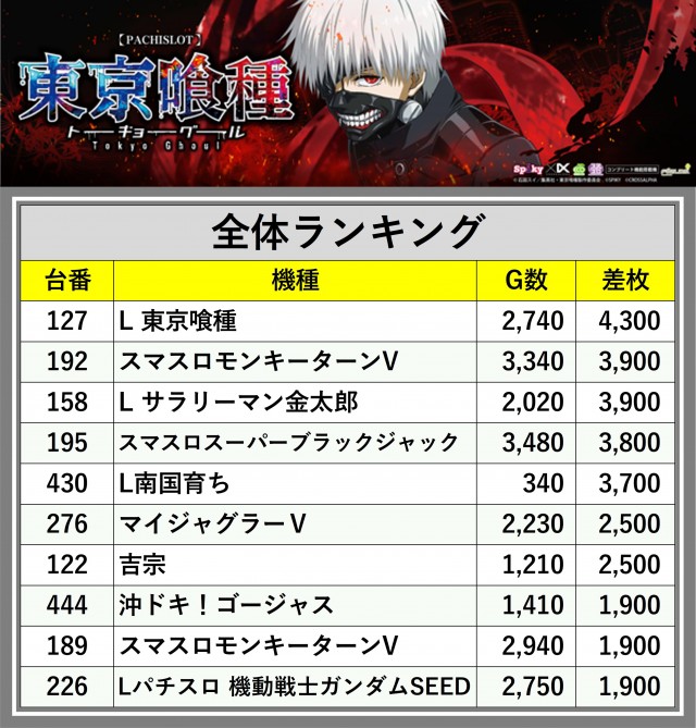 厳選された取材対象機種をはじめ、その他スロット全体から好記録が飛び出した!プレイヤーが楽しんだ1日を下記データにて振り返ってみて欲しい。