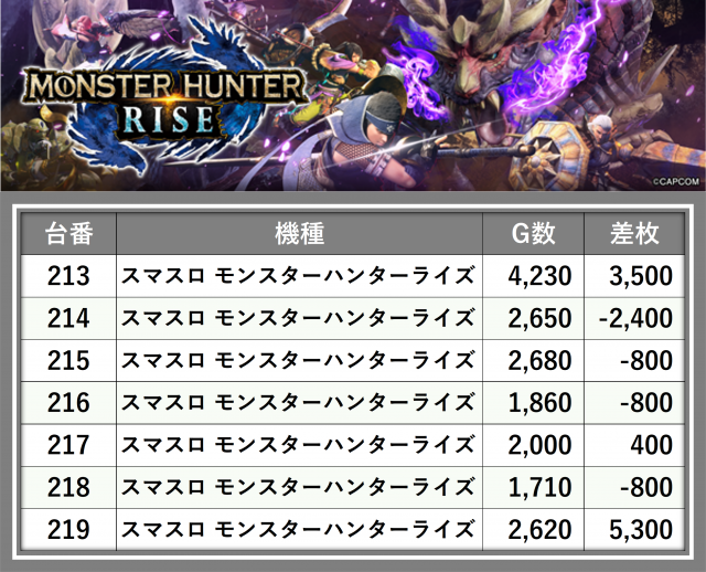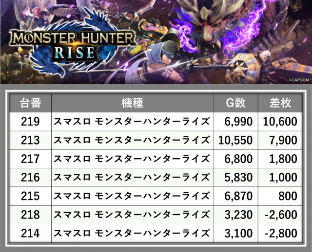 厳選された取材対象機種をはじめ、その他スロット全体から好記録が飛び出した!プレイヤーが楽しんだ1日を下記データにて振り返ってみて欲しい。