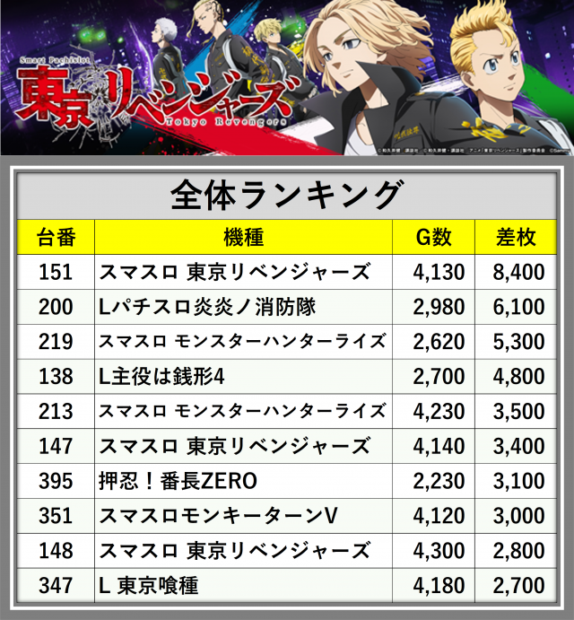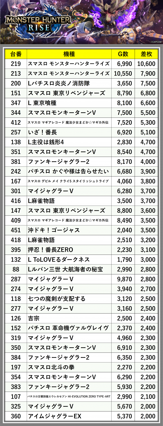 ※差枚数順に掲載しています