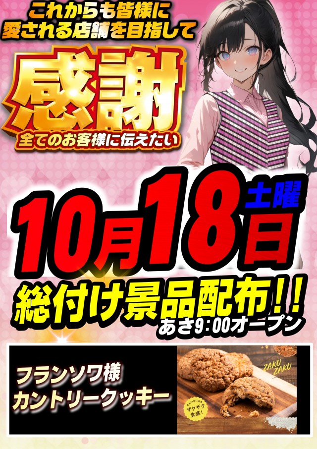 光市『メガガイア光ツインパークⅠ』です。【明日のご案内】 10月18日(土) ✨総付景品配布✨ あさ9時オープン! ----------------------------- 和洋菓子フランソワ様 カントリークッキー ----------------------------- ⚡10月ガイアグループ全店おすすめ⚡ Pエヴァンゲリオン15~未来への咆哮~ ⭐☆⭐総付景品配布⭐☆⭐  ⭐☆⭐総付景品配布⭐☆⭐