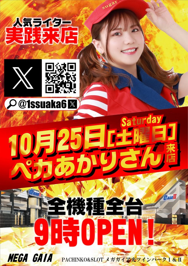 光市『メガガイア光ツインパークⅠ』です。【本日のご案内】 10月25日(土) 人気ライターの ペカあかりさん来店 ✨ジャグラー景品入荷✨ あさ9時オープン! ⭐☆⭐ペカあかりさん来店⭐☆⭐  ⭐☆⭐ペカあかりさん来店⭐☆⭐  ⭐☆⭐ペカあかりさん来店⭐☆⭐  ⭐☆⭐ペカあかりさん来店⭐☆⭐