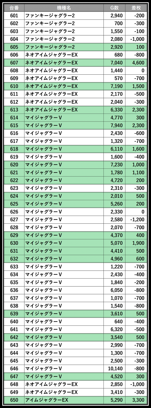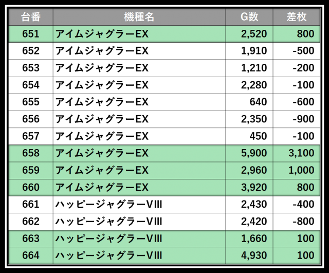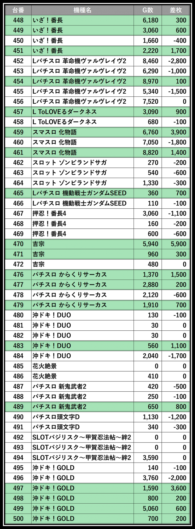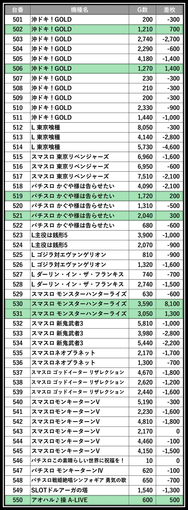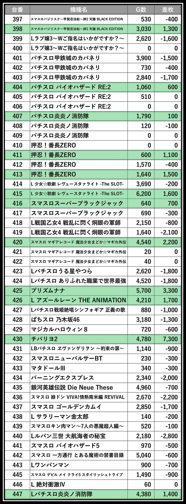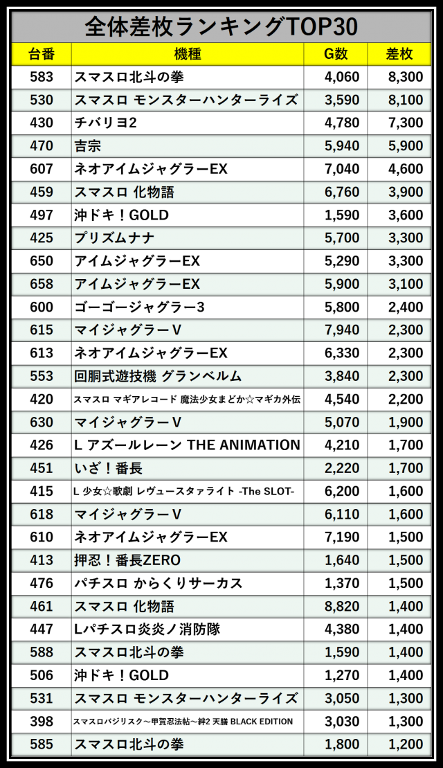※差枚数順に掲載しています