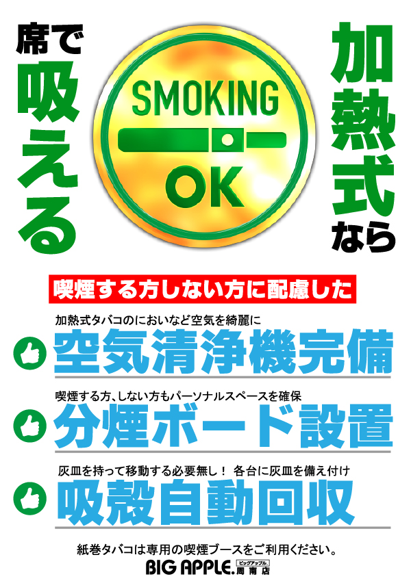 この後も少し遊んでいきませんか?ビッグアップル.周南店なら・・・加熱式電子タバコが遊技しながら吸えます本日5月23日春のパチパチファン感謝デー