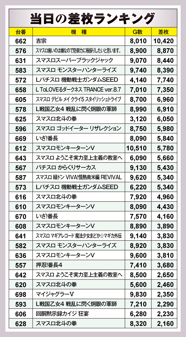 優秀台を見てみると、トップに立ったのは、662番台が+10,420枚を記録した『吉宗』。レジェンド機種の名を受け継ぐだけあって、ファンの期待にしっかり応えている。それに続いたのが+8,870枚だった『スマスロ痛いのは嫌なので防御力に極振りしたいと思います。』の576番台。防御力どころか攻撃力もなかなかの台だ。+8,440枚で3位となった『スマスロスーパーブラックジャック』631番台は、G数も9,000Gオーバー。稼働も申し分なかった。それ以上の稼働を見せたのが、+8,390枚の『スマスロ モンスターハンターライズ』583番台。G数は9,740Gを記録。台への高い信頼がうかがえる。以下、+7,740枚の『Lパチスロ 機動戦士ガンダムSEED』572番台、+7,350枚の『L ToLOVEるダークネス TRANCE ver.8.7』658番台、+6,960枚の『スマスロ デビル メイ クライ5 スタイリッシュトライブ』605番台と続いた。また、差玉ランキングでは12位だった『スマスロモンキーターンV』612番台は、G数が10,510Gを記録しており、稼働においてはトップに立っている。