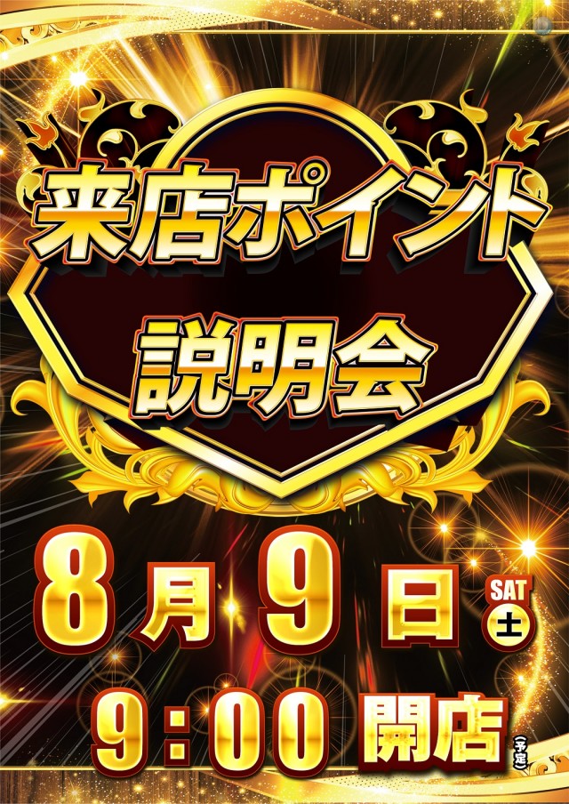 本日8/9(土)来店ポイント説明会9:00開店(予定)