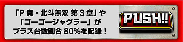 『ゴーゴージャグラー』は10台中8台がプラス、『マイジャグラーⅢ』は20台中14台がプラスと、ジャグラーシリーズの2機種がプラス台数割合70%を超えた。