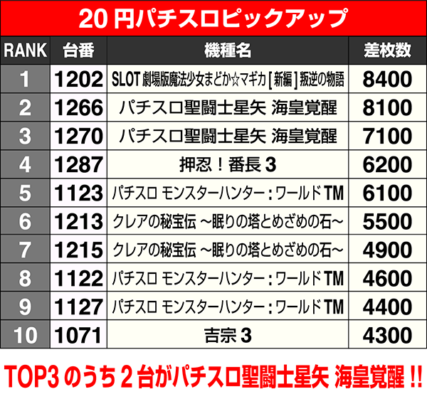 1202番台の『SLOT劇場版魔法少女まどか☆マギカ[新編]叛逆の物語』と1266番台の『パチスロ聖闘士星矢 海皇覚醒』が+8000ptオーバー。