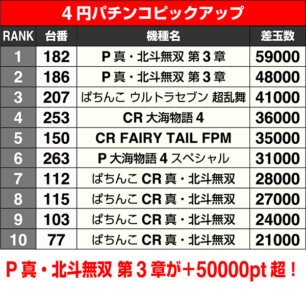 最新機種の『P真・北斗無双 第3章』は10台中8台がプラス。182番台がこの日唯一となる50000ptオーバーでNo.1を獲得した。