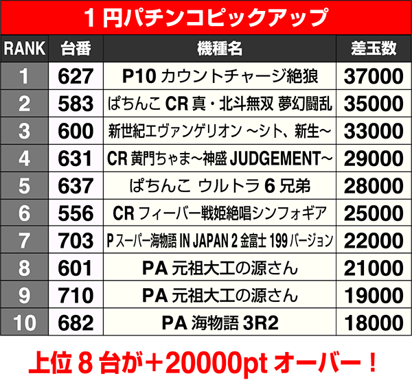 20円パチスロ、4円パチンコ、1円パチンコの上位10機種をまとめて公開!