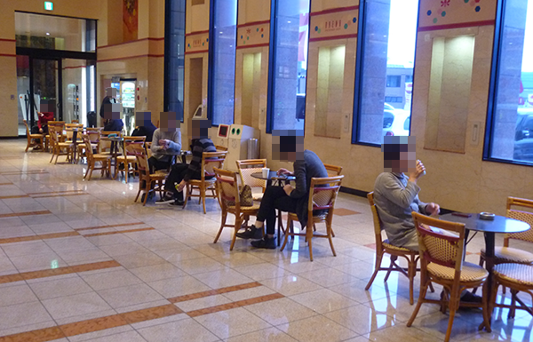 14時を過ぎた頃の20円パチスロでは、「バジリスク〜甲賀忍法帖〜絆」や「ミリオンゴッド-神々の凱旋-」といったAT・ART機が盛り上がっており、笑顔のプレイヤーも多数。