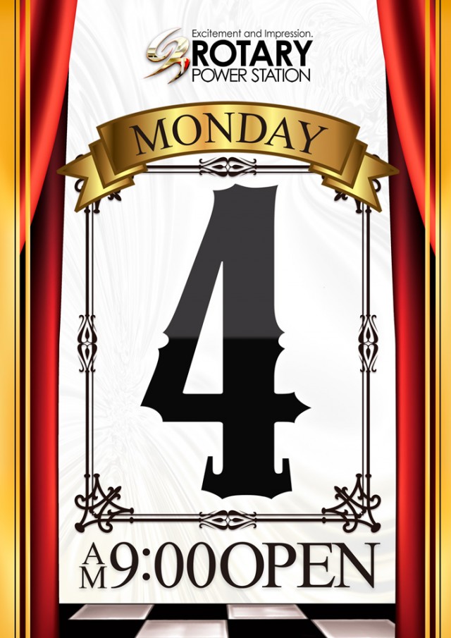 2025/08/04月曜ROTARYおはようございます。 8月4日(月) ★月曜ROTARY★ 全機種朝9時オープン  最新機種 導入済 全機種全台 朝9時堂々開店  入場整理券の配布時間は 朝8時30分からです。 皆様のご来店を 従業員一同 お待ち致しております。