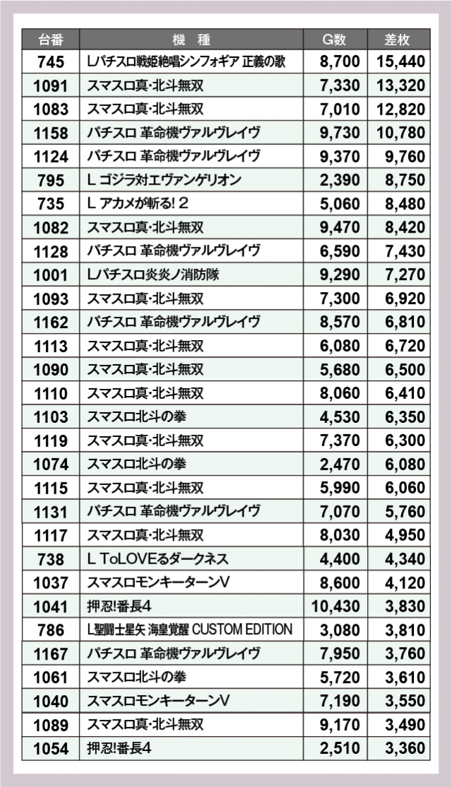 ※差枚数順に掲載しています
