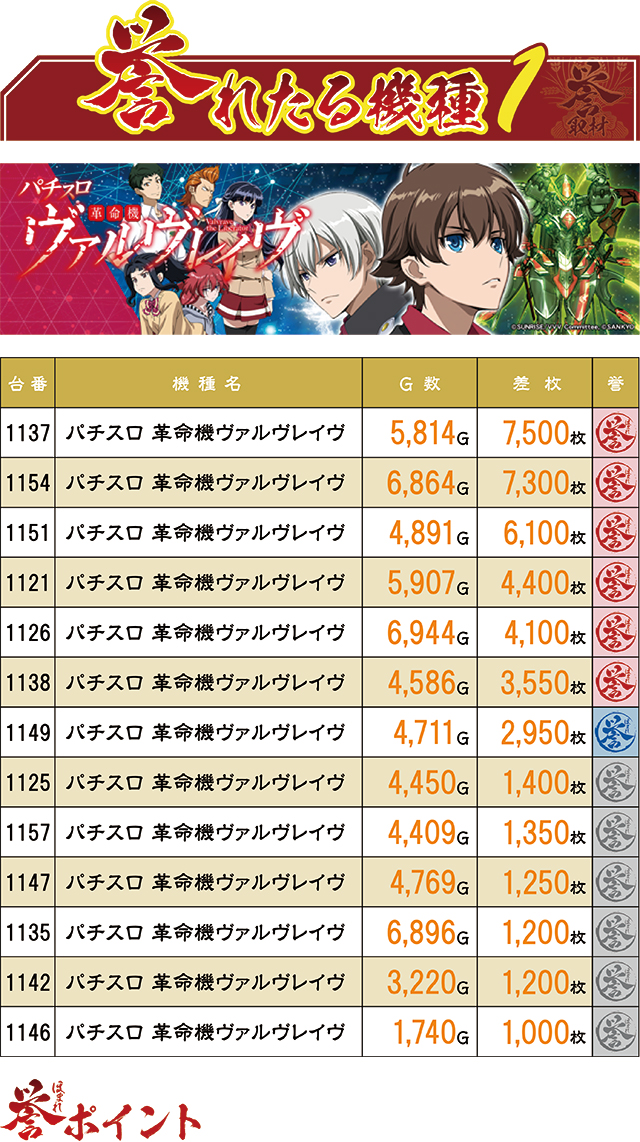 なんと40台(!)もの台数が設置されている『パチスロ 革命機ヴァルヴレイヴ』だけに、13台の誉レコード(=1,000枚以上)が出現!その約半数が赤誉マーク(=3,000枚以上)という桁外れの結果となった。