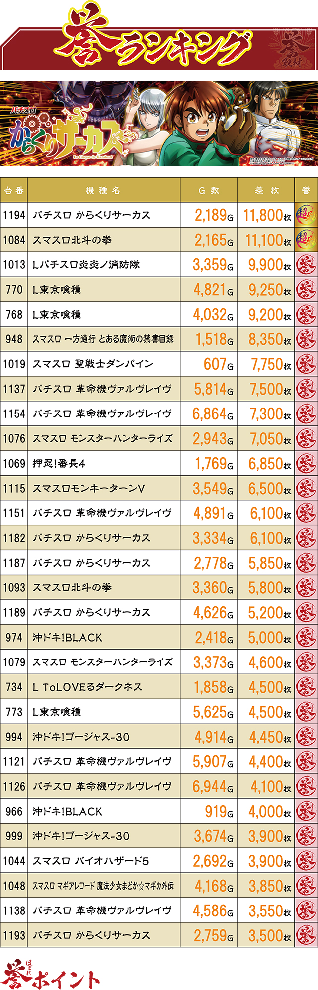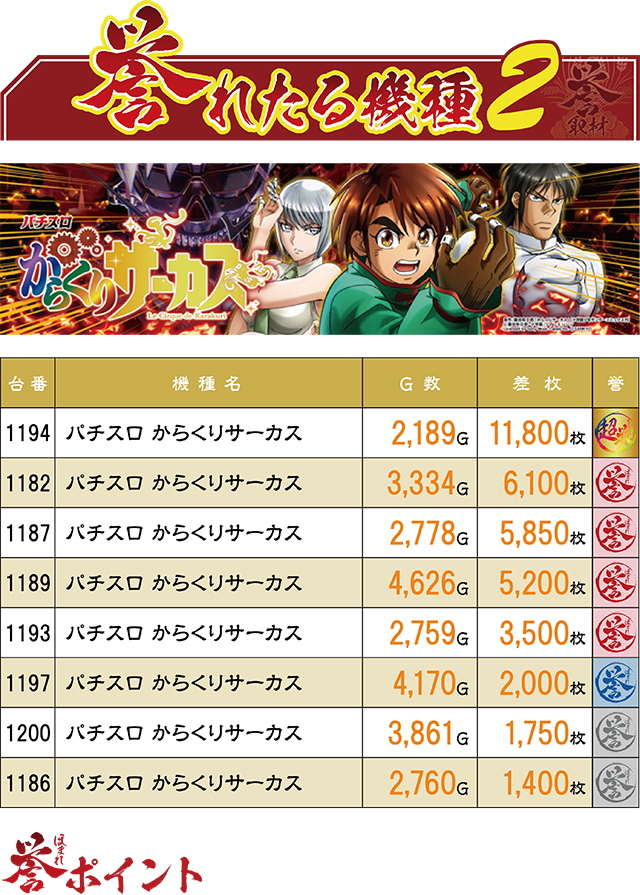 この日の最高差枚記録となった1194番台を筆頭に、誉レコードが計7台!この見事な結果から察するに、『パチスロ からくりサーカス』にはかなりの数のチャンスが潜んでいた…!?