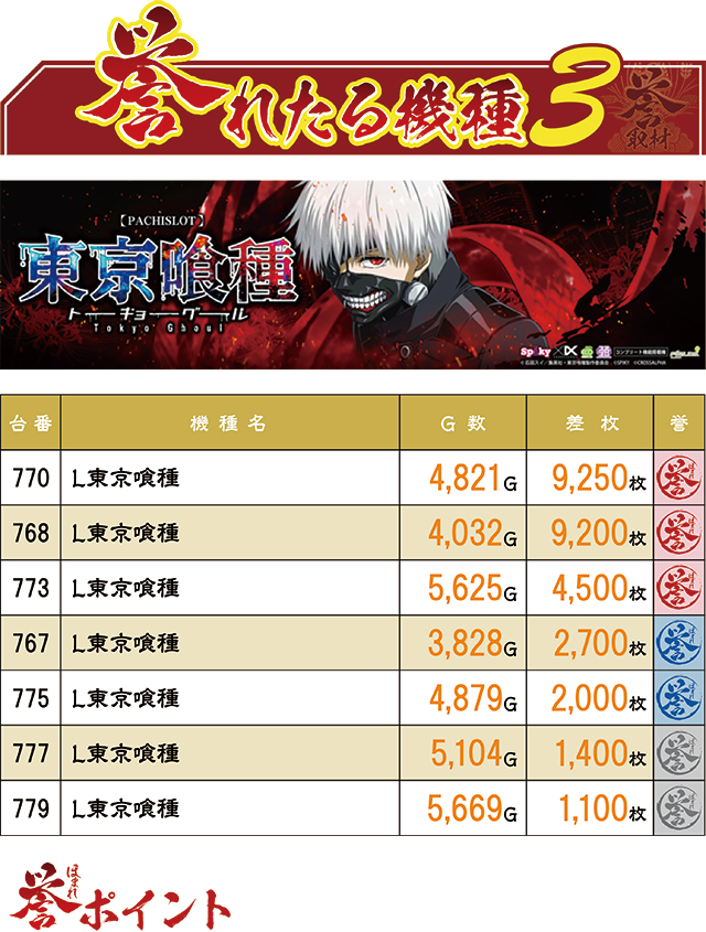設置の約半数が誉レコードとなった『L東京喰種』。赤誉マークは3台、内2台が9,000枚オーバーという凄まじい内容だった。今後も『L東京喰種』の動向には注視すべきだろう。