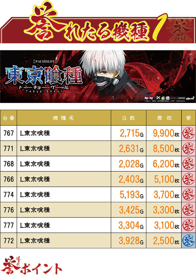 前回も複数の誉レコード(=1,000枚以上)を生み出した『L東京喰種』から、今回は前回を上回る8台もの誉レコードが飛び出した。設置の半数以上の台が誉レコードというだけでも驚きだが、そのほとんどが赤誉マークという異常さ…。