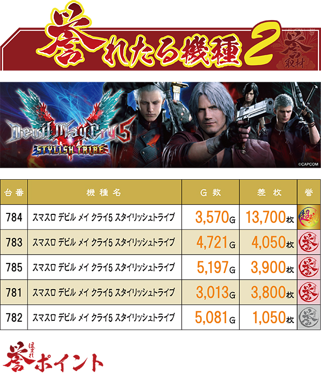 3台の10,000枚レコードを叩き出した今回。当たり前のように複数の10,000枚超え台が出現したばかりか、TOP30記録がすべて赤誉マーク(=3,000枚以上)という結果に。注目はさっそく誉ランキングの2位にランクインした新台『スマスロ デビル メイ クライ5 スタイリッシュトライブ』!