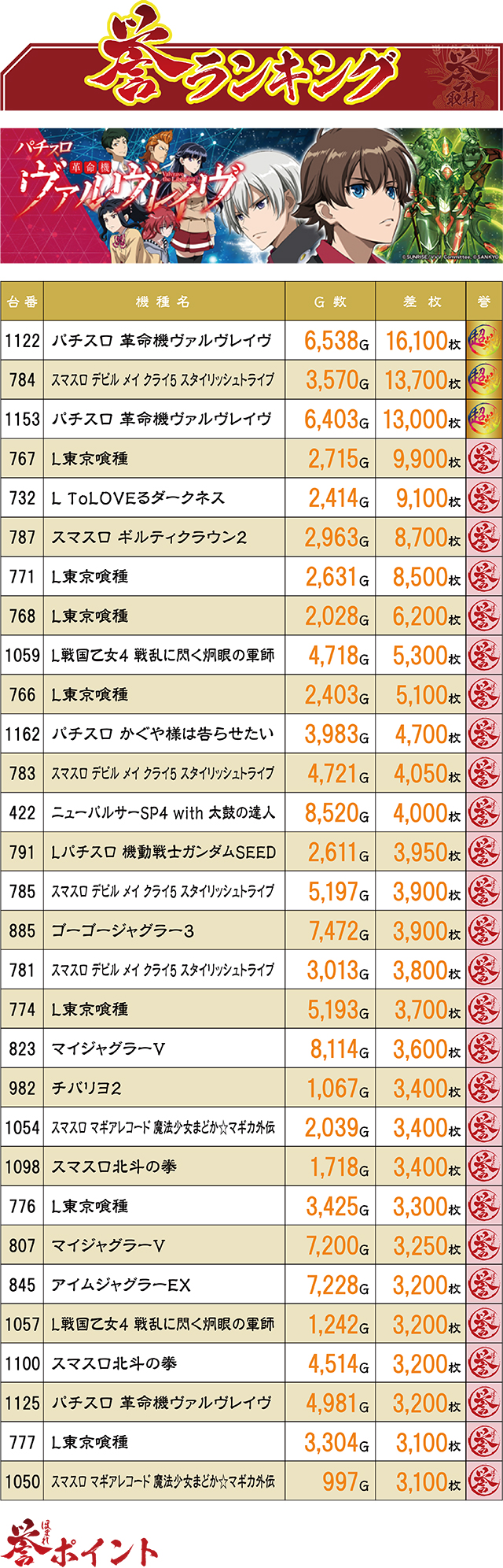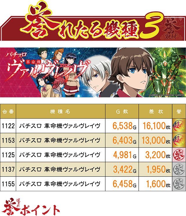 誉ランキングTOP3の内の2台を独占した『パチスロ 革命機ヴァルヴレイヴ』。多台数設置ゆえの強みを存分に発揮し、この日も圧倒的な存在感を見せつけてくれた。
