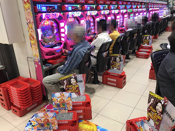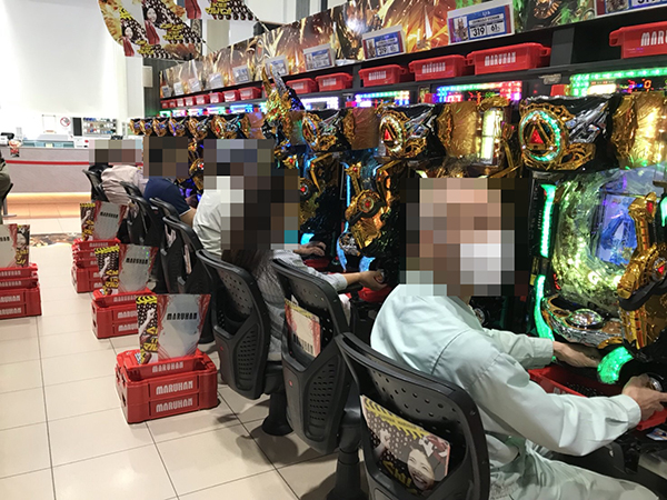 大きくにぎわう1円パチンコでは、海物語シリーズをはじめとする様々なタイプが好まれ、空き台も少なく盛況な様子であった。