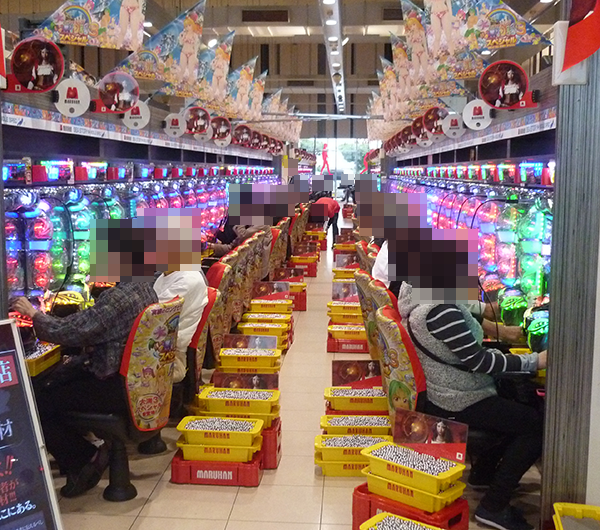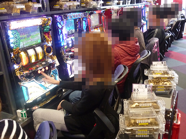 14時を過ぎる頃の4円パチンコでは、新台の「CR牙狼 魔戒ノ花」が満席という盛況ぶりをみせていた。